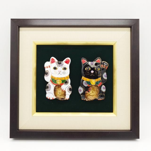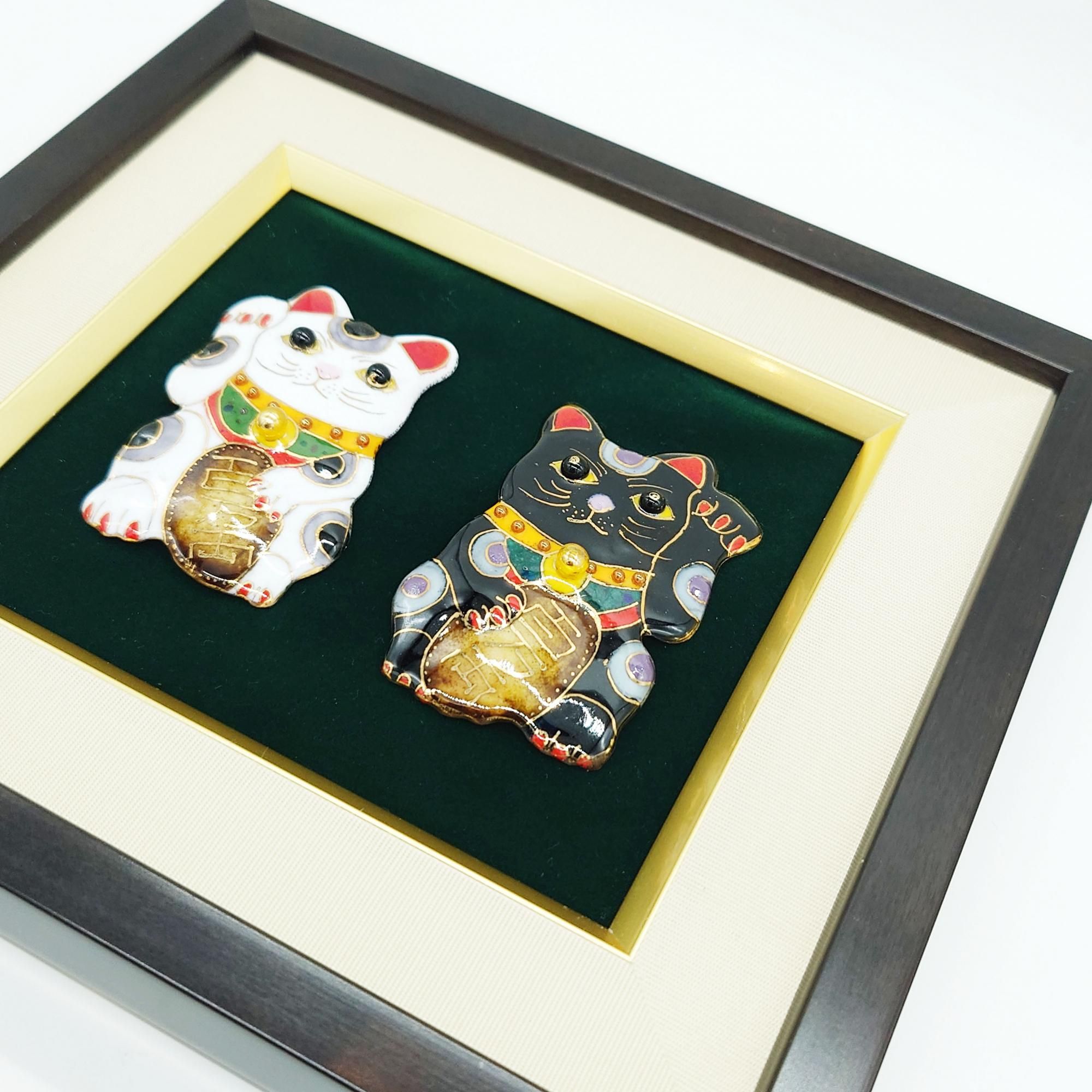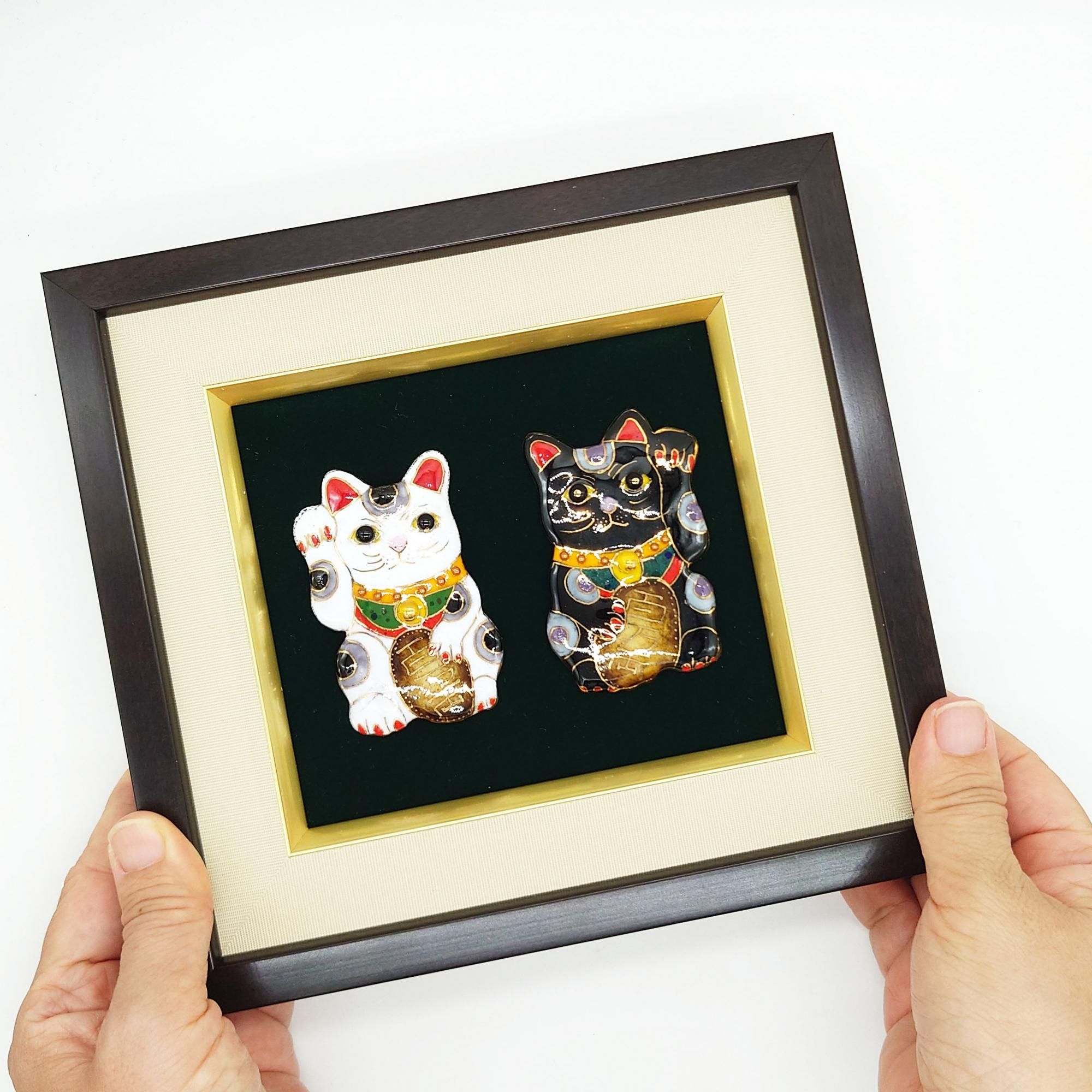 金縁のフレームに、七宝焼で仕上げた白猫と黒猫の招き猫を並べて額装しました。