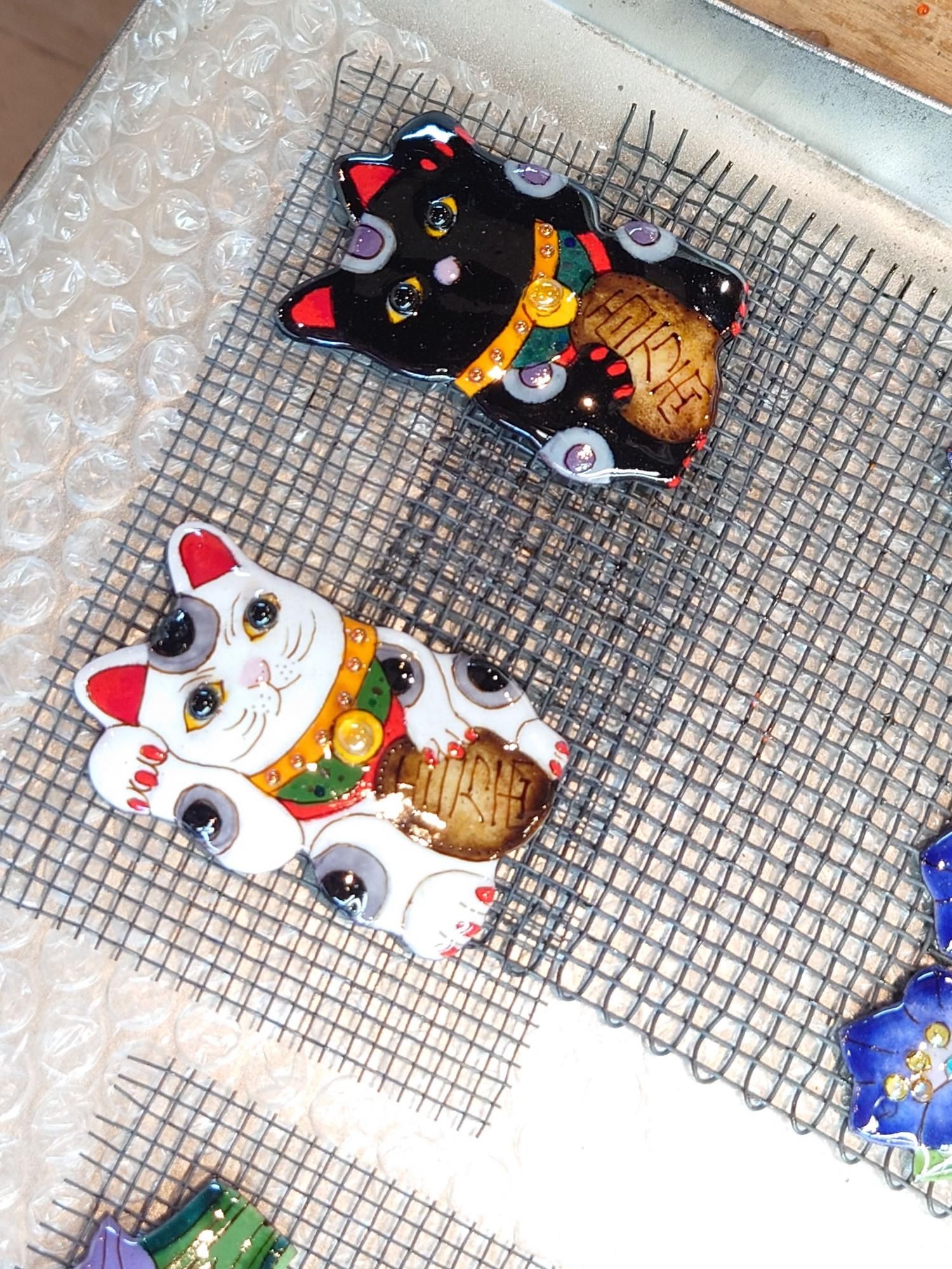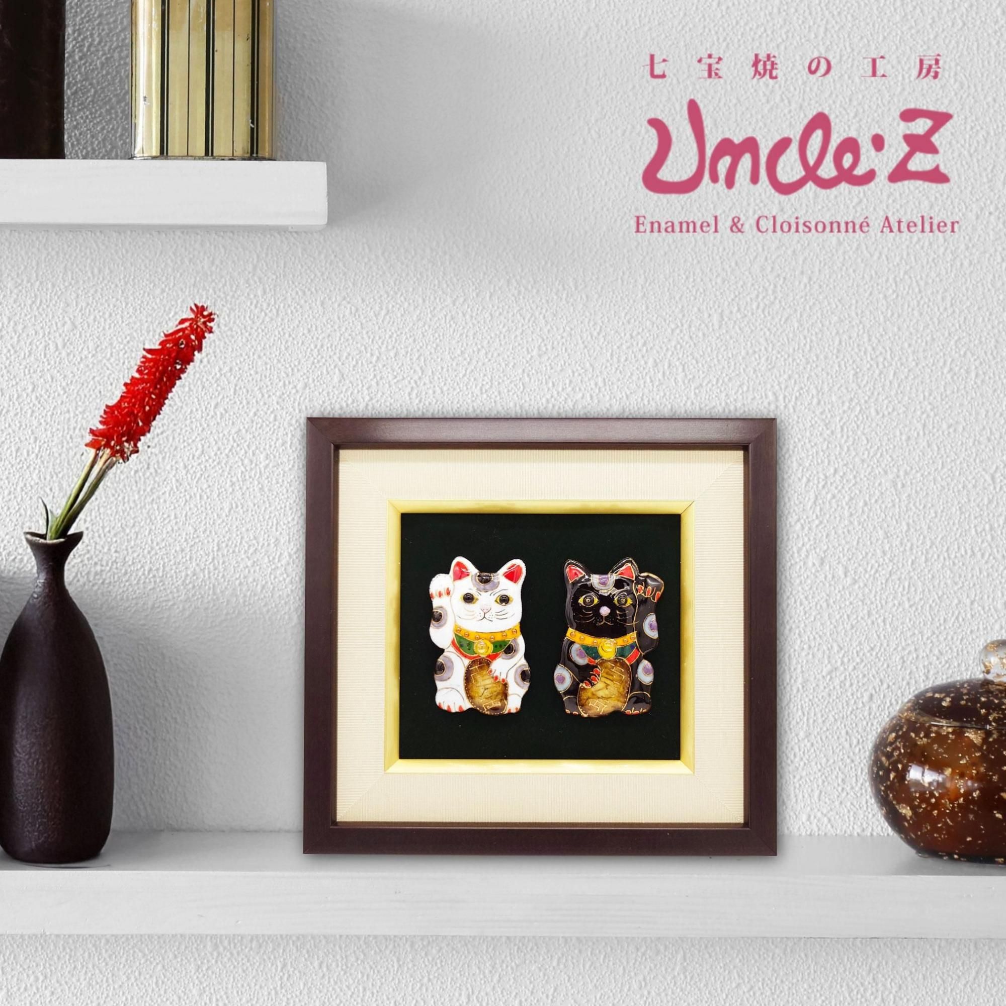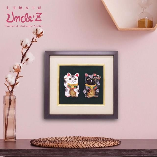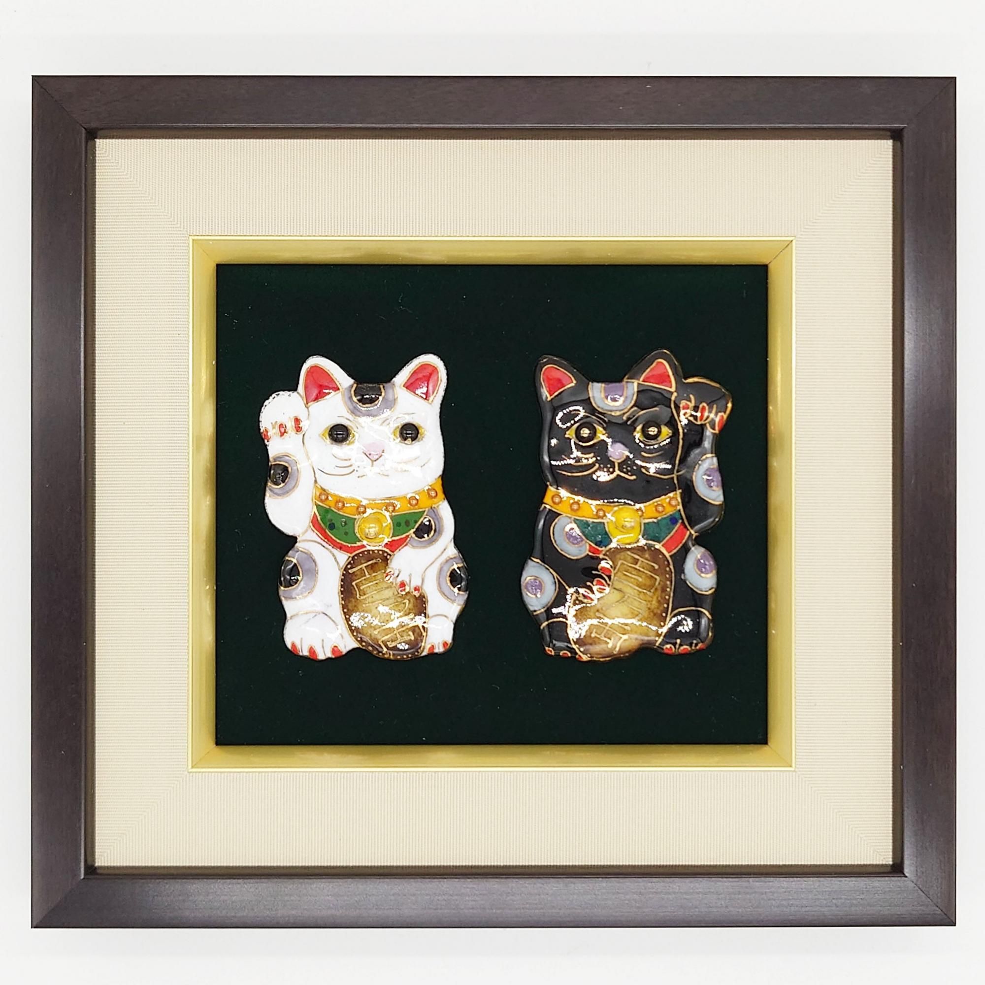 金縁のフレームに、七宝焼で仕上げた白猫と黒猫の招き猫を並べて額装しました。