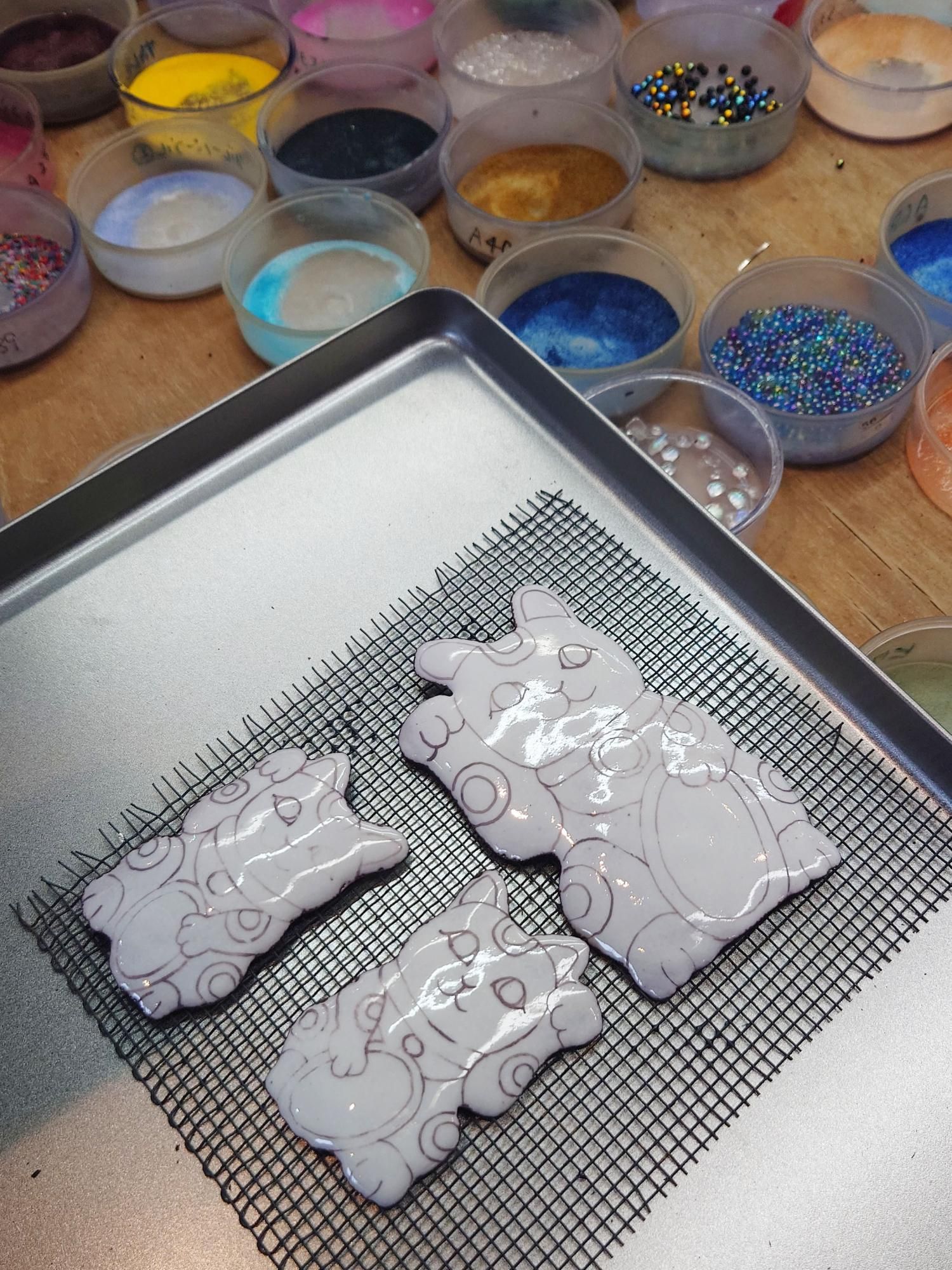 鮮やかな釉薬にチタンガラスのフリットをちりばめ、表情豊かなきらめきをプラス。